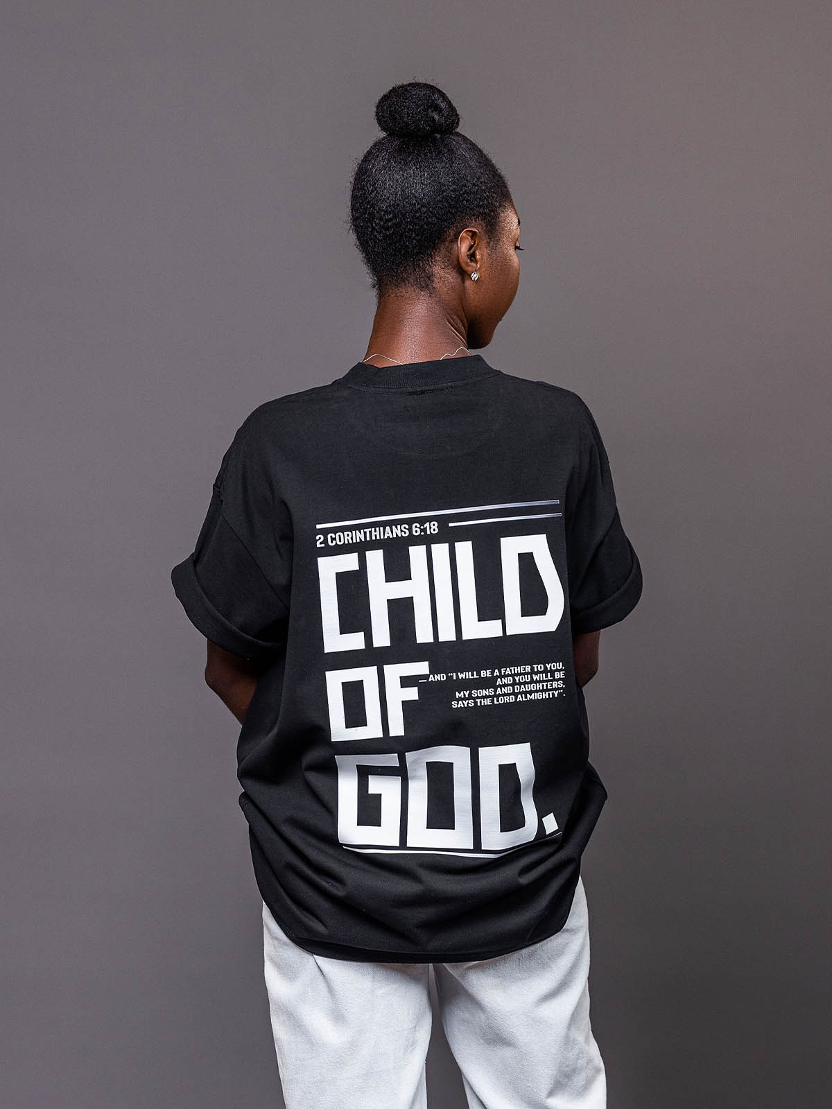 The back makes an undeniable declaration of identity. Bold, contrasting white typography proclaims “CHILD OF GOD.” Above this statement, the shirt features the full, inspiring scripture from 2 Corinthians 6:18: “AND ‘I WILL BE A FATHER TO YOU, AND YOU WILL BE MY SONS AND DAUGHTERS,’ SAYS THE LORD ALMIGHTY.”