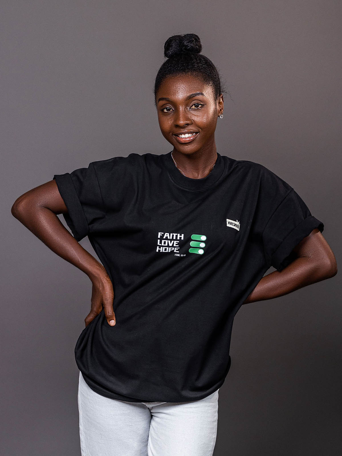 This black graphic t-shirt is a powerful fusion of timeless scripture and contemporary design. On the front, it features the foundational triad—Faith, Love, Hope—accompanied by three modern toggle switches set to the ‘On’ position, visually representing that these virtues should be fully activated in your life. The graphic is grounded by the scriptural reference 1 COR. 13:13.